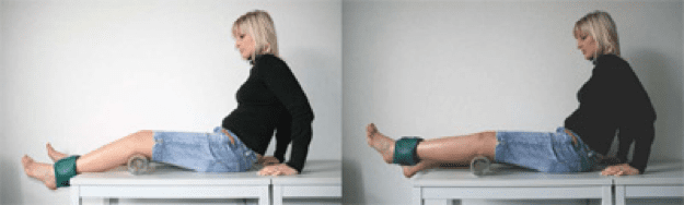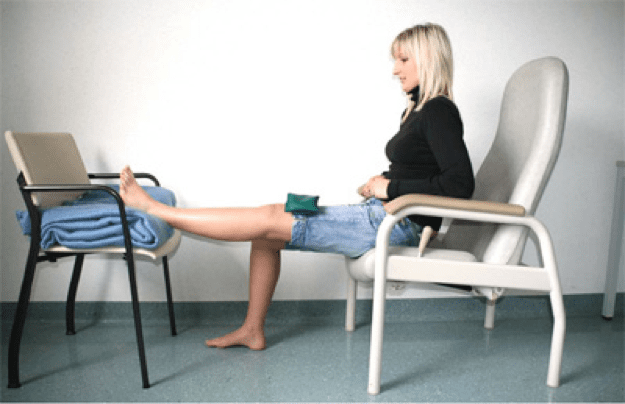 Ga op de rand van een stoel zitten en leg je voet op een andere stoel. Onder je voet leg je een dik kussen zodat je been in hoogstand ligt. Het onderbeen noch het bovenbeen mag gesteund zijn. Leg een gewichtzak van 2–3 kg juist boven de knieschijf en blijf zo 20 tot 30 minuten zitten. Zoek afleiding (bvb. TV, boek, breien).