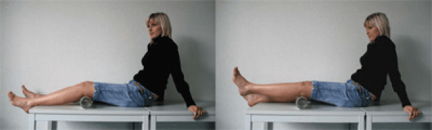 Je gaat op de rand van de tafel zitten met de voeten van de grond en de knieën geplooid. Vervolgens ga je zwieren met de benen zodat de knie afwisselend geplooid en gestrekt wordt (30 sec). De plooistand moet zachtjes verhoogd worden.