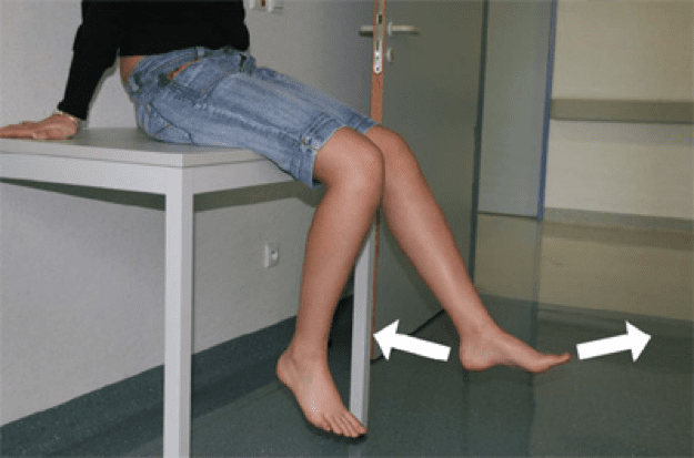 Je gaat op de rand van de tafel zitten met de voeten van de grond en de knieën geplooid. Vervolgens ga je zwieren met de benen zodat de knie afwisselend geplooid en gestrekt wordt (30 sec). De plooistand moet zachtjes verhoogd worden.